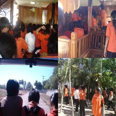 ก็นั่งรถตาลไปวัดที่จะไปทำบุญค่ะ บนรถมีบลู เปีย ติ๊ก อาย ปลา เมย์ รติ และพิ้งค์